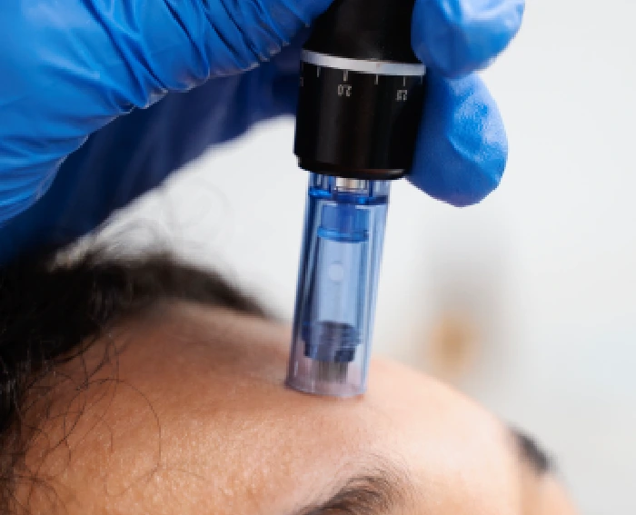 HydraFacial Keravive is a comprehensive treatment that cleanses, exfoliates, and hydrates both the scalp and hair follicles. This procedure effectively eliminates dirt, oil, flakes, dead skin cells, and impurities from the scalp surface and hair follicles. Simultaneously, it stimulates scalp circulation. Keravive further enhances the treatment by infusing the scalp with growth factors and skin proteins, specifically designed to nourish and stimulate both the scalp and hair follicles